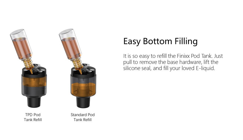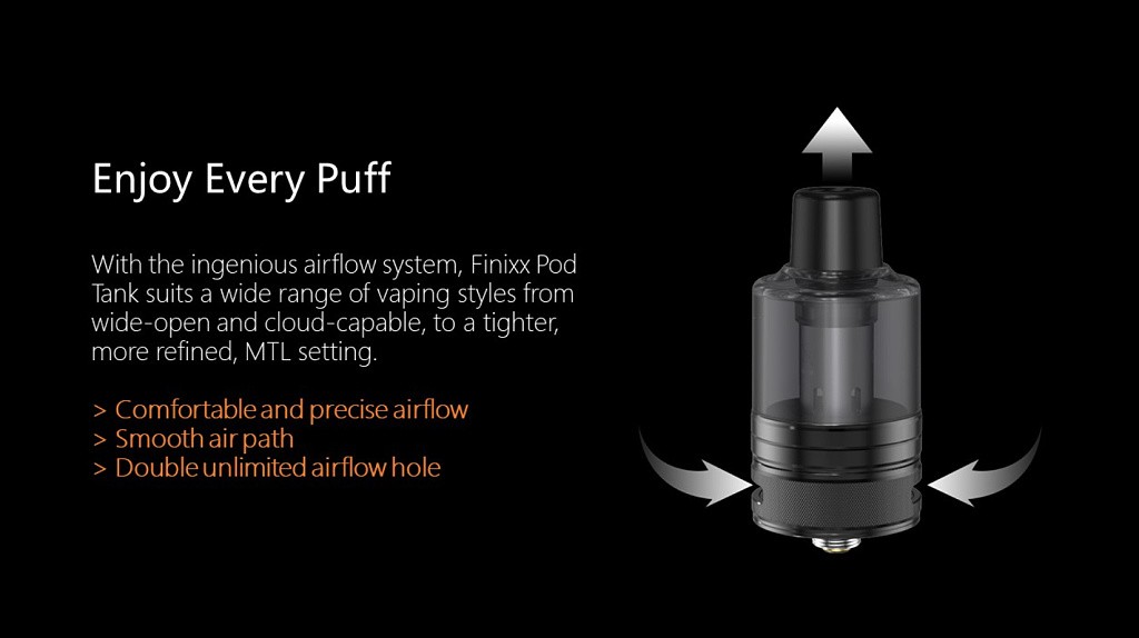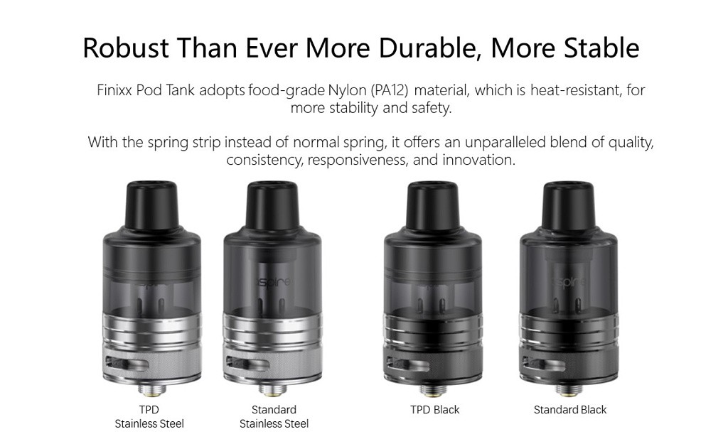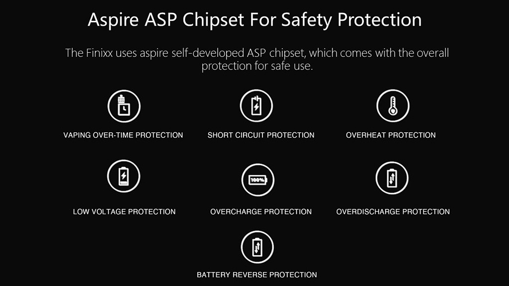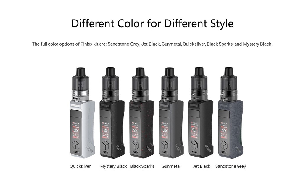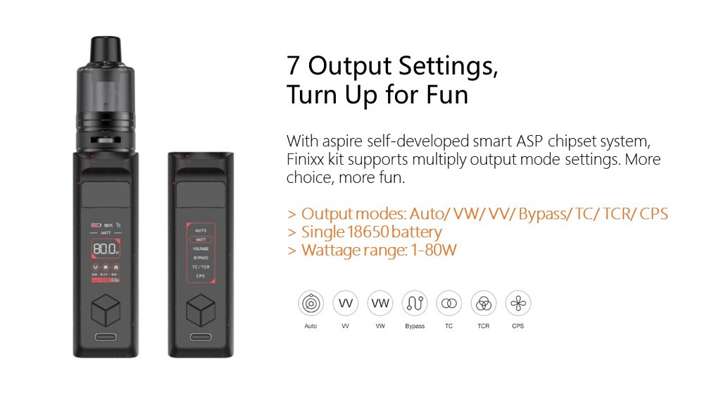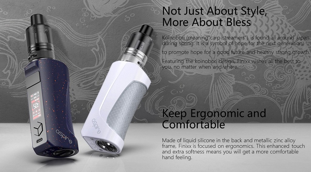 Nově uvedený mód a pod tank Aspire Finixx je vyroben ze slitiny zinku se silikonovou podložkou na zadní straně, tím je Aspire Finnix ergonomické zařízení s pohodlným úchopem. Mód kombinuje měkký silikon a robustní kovovou slitinu zinku, čímž se zaměřuje na ergonomii s mnohem pohodlnějším pocitem držení v ruce. Výstupní výkon modu je variabilní (1 až 80 watt).