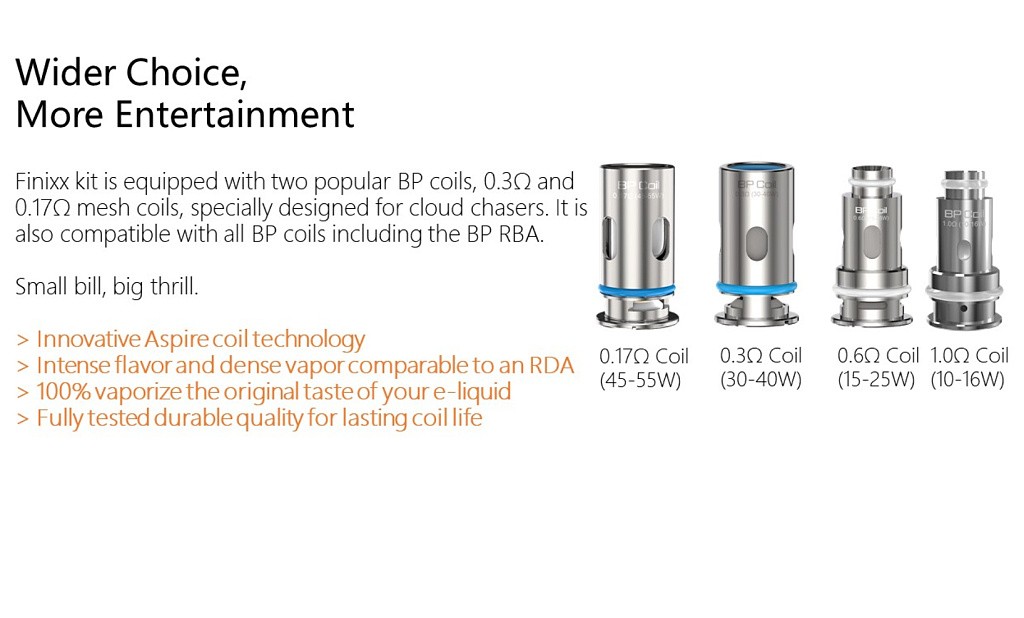 Aspire Finixx je dodáván se dvěmi DL žhavícími hlavami s odporem 0,3 a 0,17ohm. Kromě toho je také kompatibilní s celou řadou DL i MTL žhavících hlav BP včetně RBA žhavící hlavy.