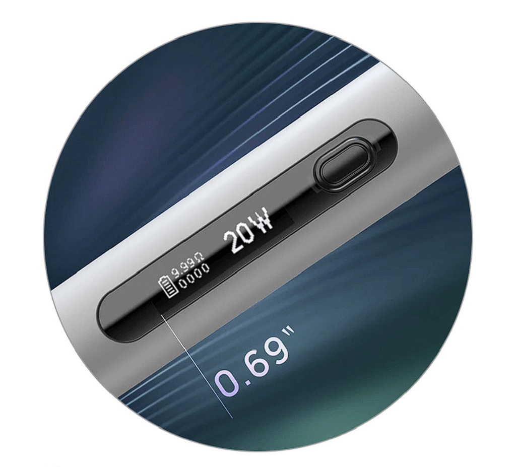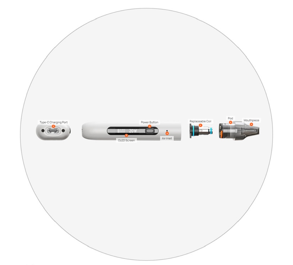 ![]() | Parametry produktu: Rozměry: 100.5 x 28.2 x 15.7 mm Způsob potahování: MTL (klasické šlukování) Metody spínání potahu: automatické Kapacita baterie: 900 mAh Výstupní výkon: 5 – 20 W (regulovatelný) Odpor tělíska v balení: 0,8 Ω (mesh) Objem cartridge: 3 ml Displej: OLED Dobíjení: USB-C port (5V / 1A) Tento výrobek není určen pro náplně obsahující nikotin. |