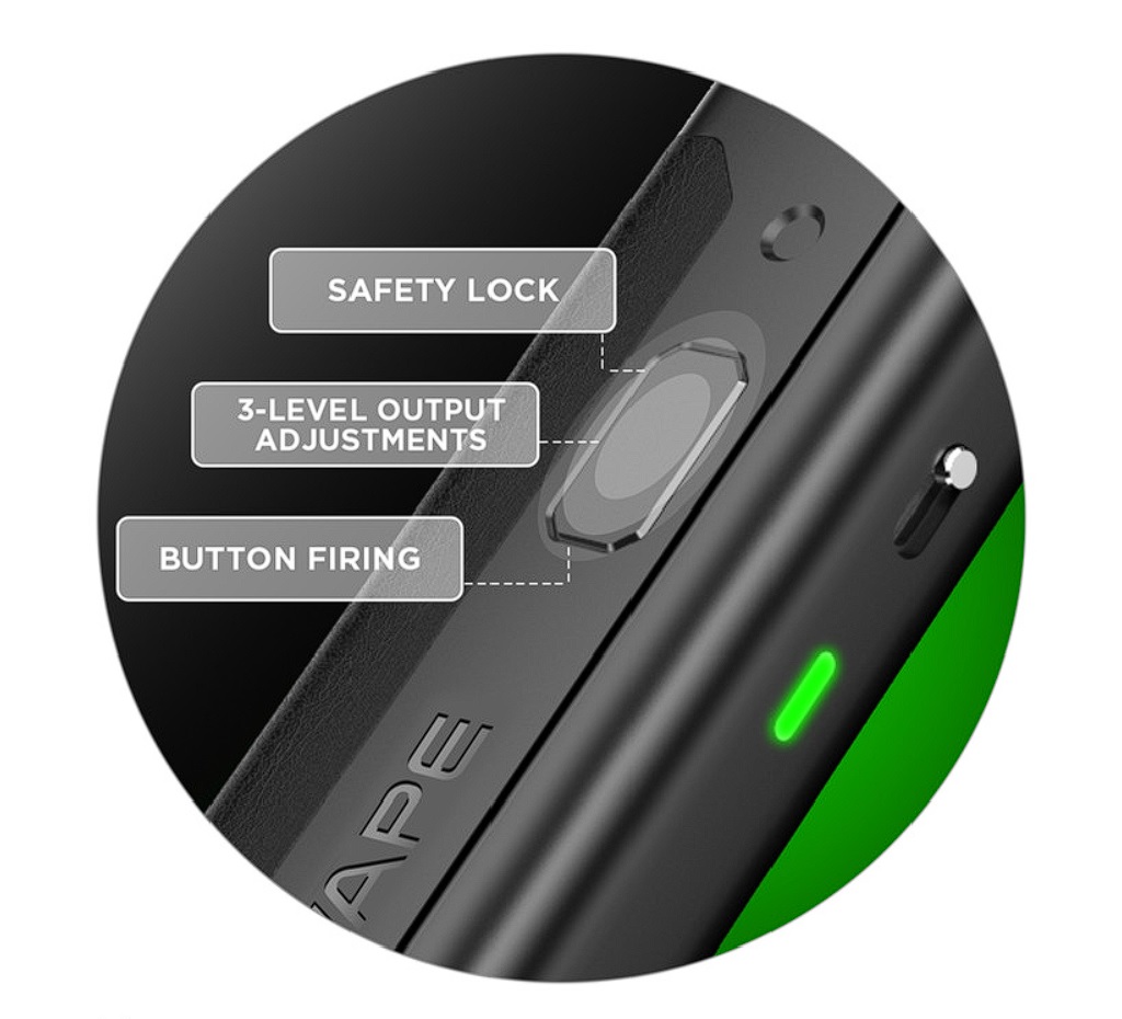 Multifunkční tlačítko Hlavní výsadou celého zařízení je praktické multifunkční tlačítko umístěné na předním panelu. Pomocí tlačítka si můžete e-cigaretu kdykoliv bezpečně uzamknout, nebo ho můžete použít pro spuštění žhavení, či pro změnu výstupního režimu intenzity. Na výběr jsou hned tři výstupní režimy pro rozdílný výstupní výkon během potahování. Celé ovládání tak hravě zvládnete pouhým jedním tlačítkem. | ![]() |