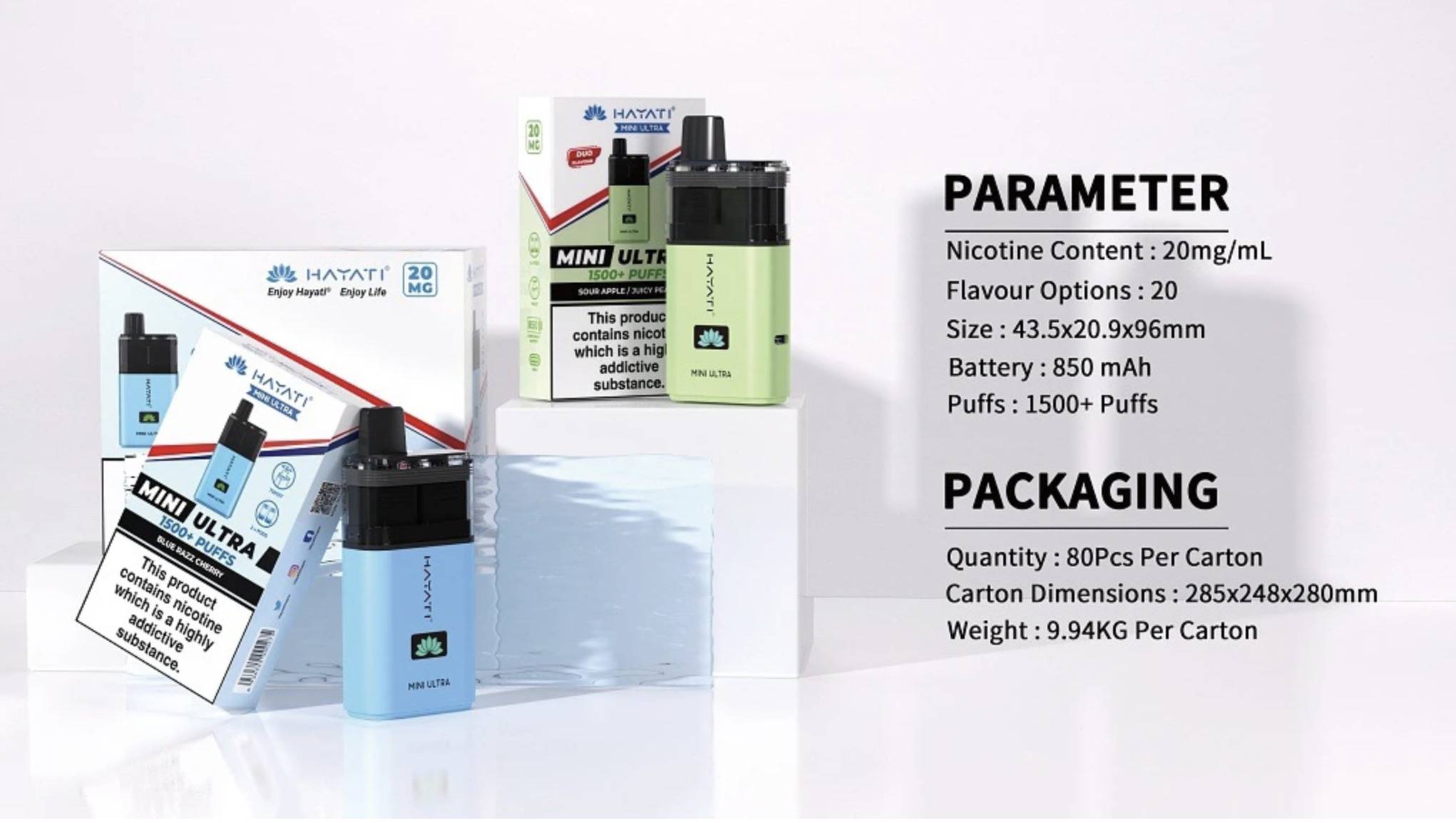 Hayati Mini Ultra se řadí mezi cenově nejefektivnější duální chuťové vape zařízení na trhu, kombinující prémiovou kvalitu s dostupnou cenou. Balení obsahuje jedno vape zařízení, uživatelskou příručku s bezpečnostními pokyny a dva přednaplněné pody (v závislosti na verzi buďto se stejnou příchutí, nebo kombinace dvou příchutí. Díky své kompaktní velikosti a výkonné baterii je Hayati Mini Ultra ideální volbou jak pro začátečníky, tak pro zkušené vapery, kteří hledají spolehlivé, dlouhotrvající a přenosné řešení pro celý den. Zařízení je navrženo tak, aby napodobovalo pocit tradičního kouření, což z něj činí perfektní volbu pro bývalé kuřáky. Unikátní duální systém příchutí tak umožňuje uživatelům objevovat různé kombinace chutí během jednoho dne bez nutnosti nosit více zařízení.