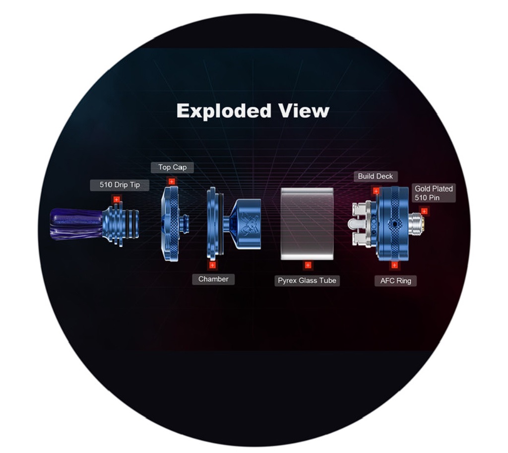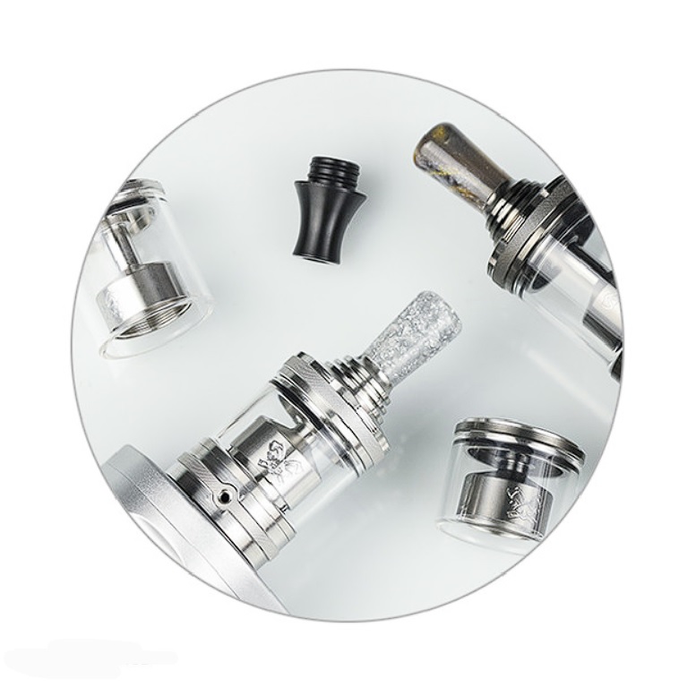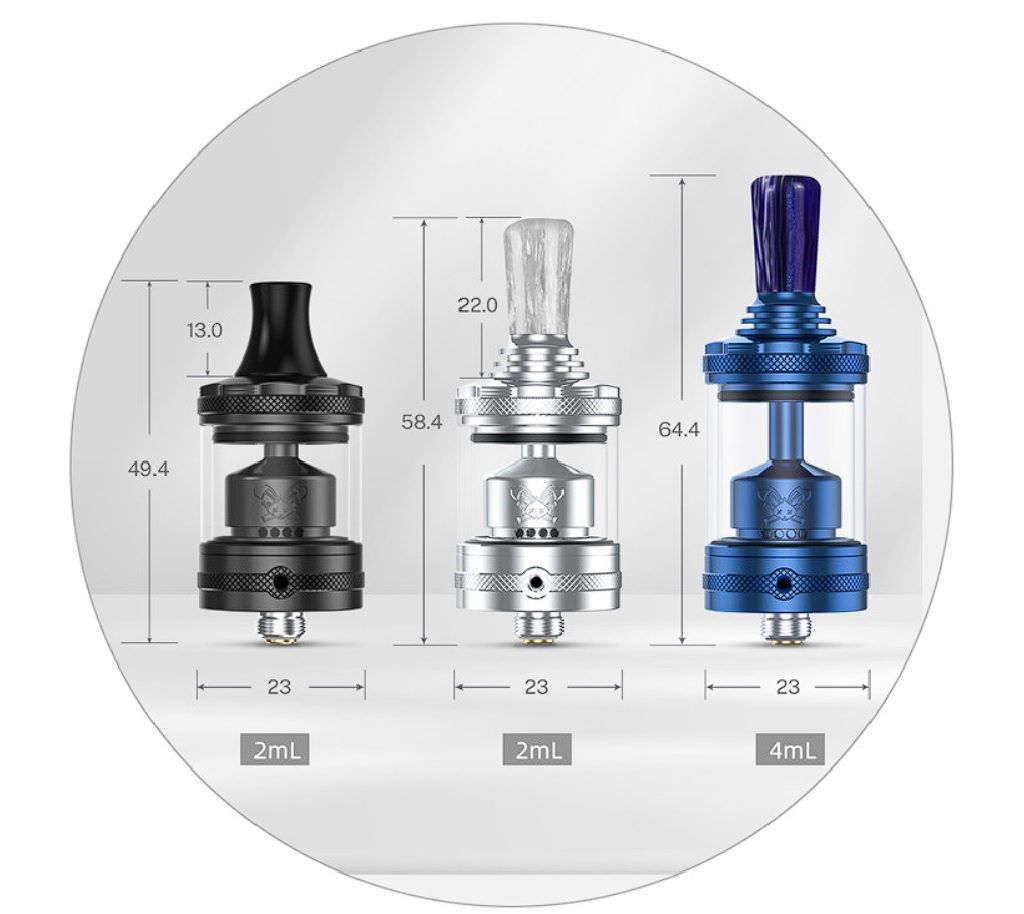 ![]() | Parametry produktu: Délka: – 64,4 mm (s objemem 4ml a dlouhým náustkem) – 58,4 mm (s objemem 2ml a dlouhým náustkem) – 49,4 mm (s objemem 2ml a krátkým náustkem) Průměr: 23 mm Objem: 2 ml / 4ml Základna: single-coil Airflow: spodní Plnění: vrchní Závit: 510 Váha: 51 g Tento výrobek není určen pro náplně obsahující nikotin. |