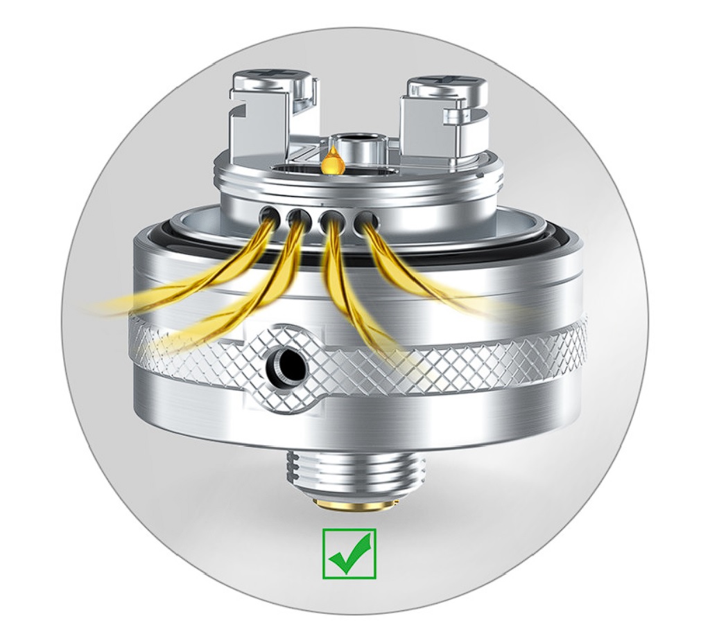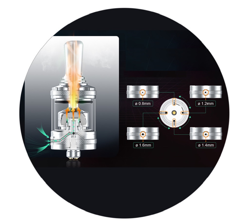 Propracované airflow Propracovaný a intuitivní systém proudění vzduchu je jedním z klíčových prvků celého atomizéru. Na těle se nachází celkem čtyři nezávislé a individuální otvory pro přívod vzduchu s průměry 0,8 mm, 1,2 mm, 1,4 mm a 1,6 mm. Prostým otáčením kroužku pro regulaci airflow si tak zvolíte požadovaný průměr vzduchového otvoru a můžete si vychutnat tuhost potahu přesně podle svých představ. | ![]() |
