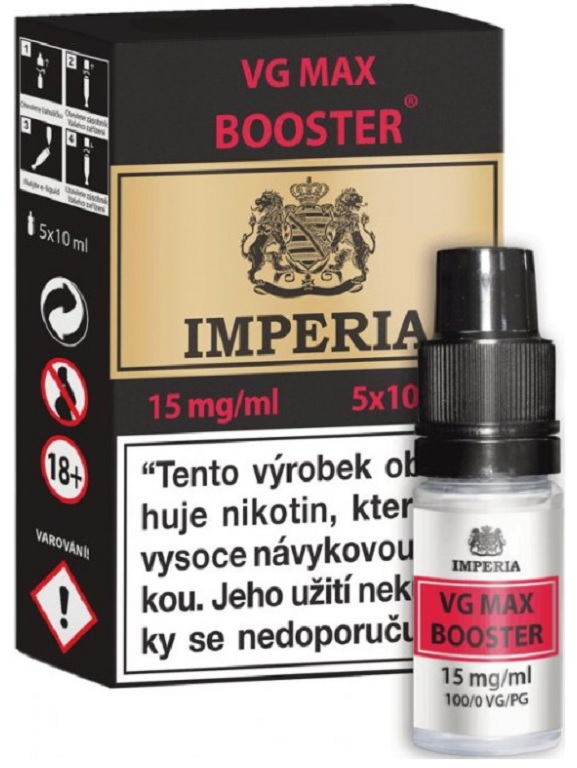 Nikotinový BOOSTER IMPERIA VG Max 10ml umožní zvýšit úroveň nikotinu v e-liquidu nebo základní bázi. Provedení VG Max tvoří výhradně nikotin a rostlinný glycerol a je určen pro bezkonkurenční kouřivost výsledného e-liquidu. Ideální volba pro všechny trikery a příznivce cloudchasingu.
