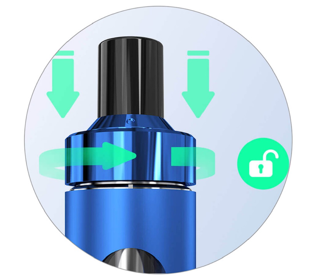 Dětská pojistka Vrchní uzávěr je opatřen speciální dětskou pojistkou, která zabrání nechtěnému otevření systému pro plnění v případě umístění v cestovním zavazadle, nebo nechtěnému otevření tanku dětmi. Pro zpřístupnění plnícího otvoru je nutné stlačit uzávěr dolů a následně jím otočit, díky této pojistce budete mít váš tank neustále v bezpečí proti případnému úniku e-liquidu. |