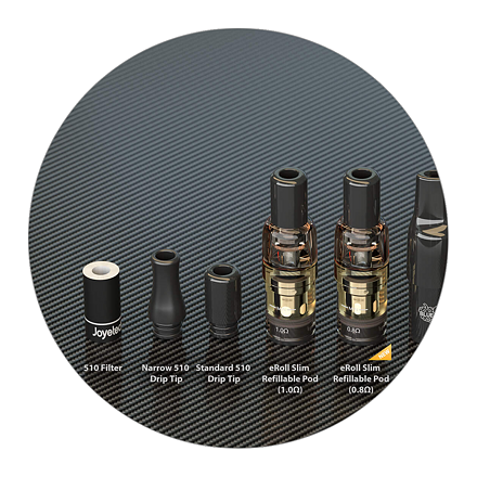 Joyetech eGo Slim je kompatibilní s kompletní platformou cartridgí Joyetech eRoll Slim. Můžete tak používat libovolný odpor cartridge eRoll Slim a libovolný typ náustku, v sérii jsou na výběr rovnou tři různé druhy, dva z nich potom najdete v základním balení. Jedná se o plastový náustek 510 Standard a filtrový náustek eRoll Slim.