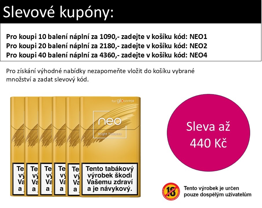Tabákové náplně NEO v novém demi formátu obsahují o 30% více tabáku a jsou určeny pro zařízení pro zahřívaný tabák glo™ Hyper+ a glo™ Hyper X2. Elegantní krabička obsahuje 20 náplní pro intenzivní a dlouho trvající chuť tabáku. Díky speciální indukční technologii dochází k rovnoměrnému zahřívání tabáku po obvodu náplně. Bezkonkurenční projev charakteristický pro zahřívaný tabák.