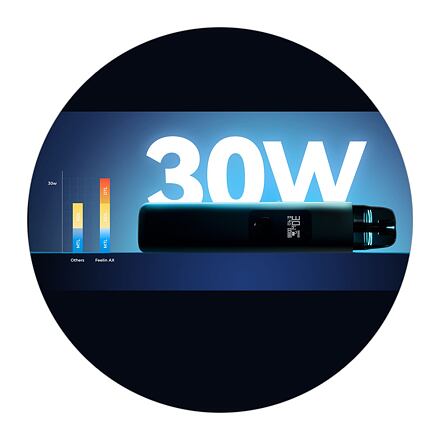 Důležitým prvkem zařízení Feelin AX je přítomnost funkce regulace výstupního výkonu. Ten lze regulovat v rozpětí 5 – 30 W, nabídne tak dostatečný rozsah pro uspokojení každodenních potřeb všech typů vaperů. Výkon si pohodlně upravíte pomocí kulatého spínacího tlačítka umístěného přímo u displeje na předním ovládacím panelu. Nastavení je rychlé, snadné a intuitivní.