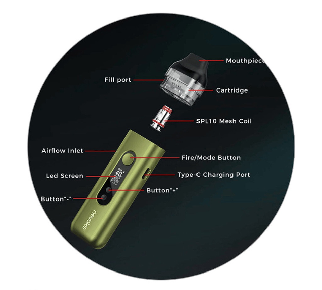 ![]() | Parametry produktu: Rozměry: 109 x 30.6 x 20 mm Způsob potahování: DL (přímé potahování) / RDL (utažené přímé potahování) / MTL (volnější klasické šlukování) Metody spínání potahu: automatické & manuální Výstupní výkon: 5 – 40 W (regulovatelný) Výstupní napětí: 3.3 – 4.2 V Podporovaný odpor: 0,3 – 1,0 Ω Kapacita baterie: 1600 mAh Objem cartridge v balení: 5 ml Odpor hlav v balení: 0,3Ω / 0,6Ω Dobíjení: USB-C port (5V / 2A) Materiál: polykarbonát (PC) + ABS + PCTG Váha: 61.5 g Tento výrobek není určen pro náplně obsahující nikotin. |