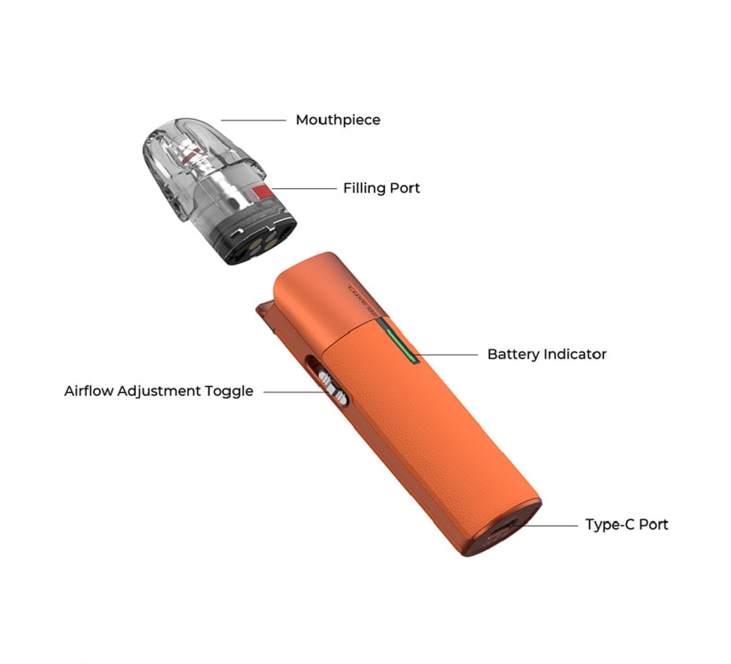 ![]() | Parametry produktu: Rozměry: 96.8 x 26 x 18.6 mm Způsob potahování: MTL (klasické šlukování) / RDL (utažené přímé potahování) Metody spínání potahu: automatické Kapacita baterie: 1000 mAh Objem cartridge v balení: 2 ml Odpor cartridge v balení: 0,6 Ω / 1,2 Ω Dobíjení: USB-C port (5V / 2A) |
