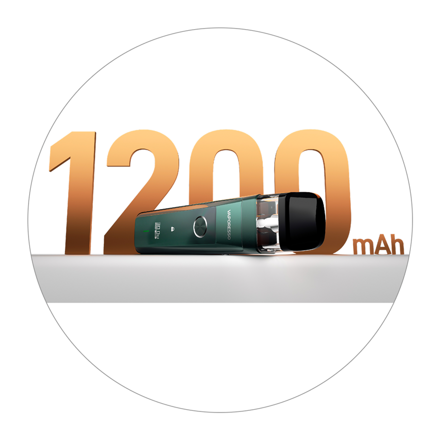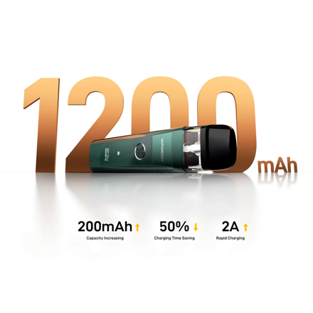 Důležitým prvkem zařízení XROS Pro je zejména jeho baterie. V těle se nachází integrovaná baterie s ohromující kapacitou 1200 mAh pro dlouhé hodiny intenzivního potahování. Velkou baterii oceníte právě při vapování s vyšší produkcí páry, klasickým MTLkařům potom nabídne skutečně dlouhou výdrž s minimem nabíjení. Zařízení zároveň podporuje rychlé 2A nabíjení prostřednictvím moderního rozhraní USB-C.