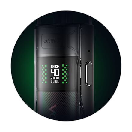 V boční části e-cigarety Argus E40 se nachází ergonomické ovládací tlačítko, které slouží nejen pro uzamčení e-cigarety a sepnutí žhavení, ale také pro nastavení výstupního výkonu. Ten je plně regulovatelný a je možné ho nastavovat v rozpětí 5 – 40 W. Snadno si tak upravíte výstupní výkon podle potřeb aktuálně používané cartridge a můžete se tak vždy těšit jen na ty nejlepší výsledky při vapování.
