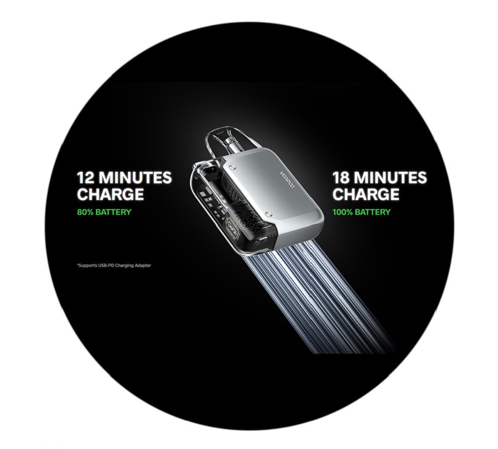 Extrémně rychlé dobíjení Jedním z klíčových prvků e-cigarety Argus P1 je přítomnost podpory extrémně rychlého nabíjení. Do plné kapacity se zvládne dobít už za 18 minut při zvolení odpovídajícího adaptéru. Tělo je kompatibilní s USB adaptéry se standardem PD 15W, po připojení takového adaptéru tak odpadá starost o jakékoliv nabíjení, jelikož budete moci mít e-cigaretu téměř neustále nabitou. * Funkce extrémně rychlého nabíjení pracuje pouze s adaptéry standardu PD 15W, při dobíjení pomocí standardního síťového adaptéru se baterie dobíjí běžnou rychlostí danou parametry vašeho adaptéru. | ![]() |