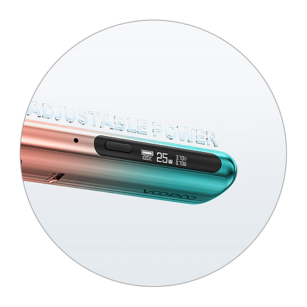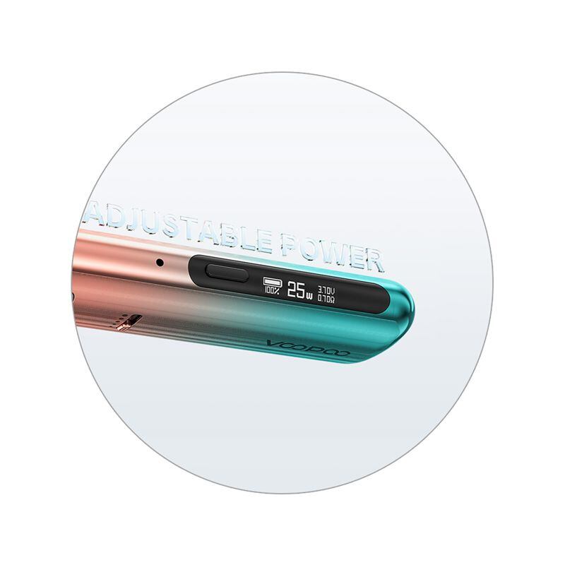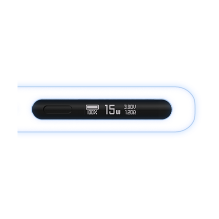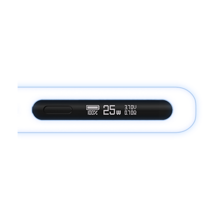 V boční části se nachází přehledný a jasný OLED displej se stručným a uživatelsky přívětivým rozhraním. Displej vás informuje o aktuálním stavu baterie, výstupním napětí, odporu cartridge a o nastaveném výkonu. Ten je možné regulovat v rozpětí 5 – 25 W. Výkon si navíc nastavíte pomocí jediného tlačítka, celkové nastavení je tak nesmírně rychlé a intuitivní.